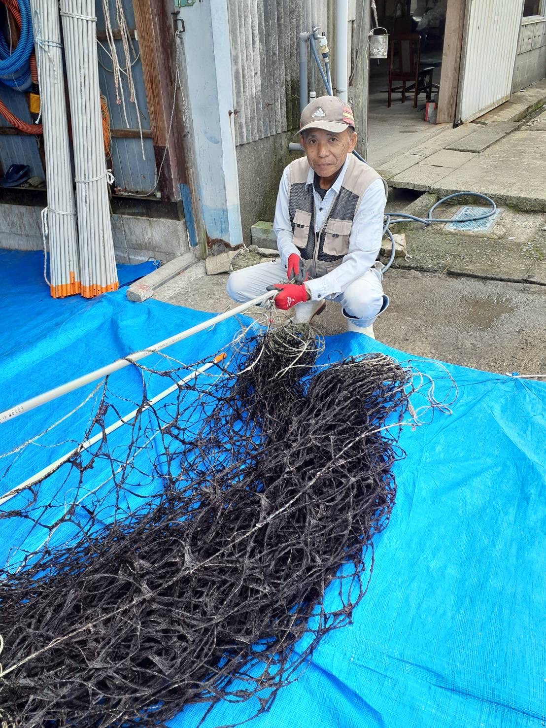 今年の天候は例年に比べて気温が高く、海苔の種付けも一筋縄ではいきませんでしたが、無事に冷凍網の天日干しにこぎつけました。それに加えて、青のりの付着が多く、毎日網を海水で洗う作業が要ります。