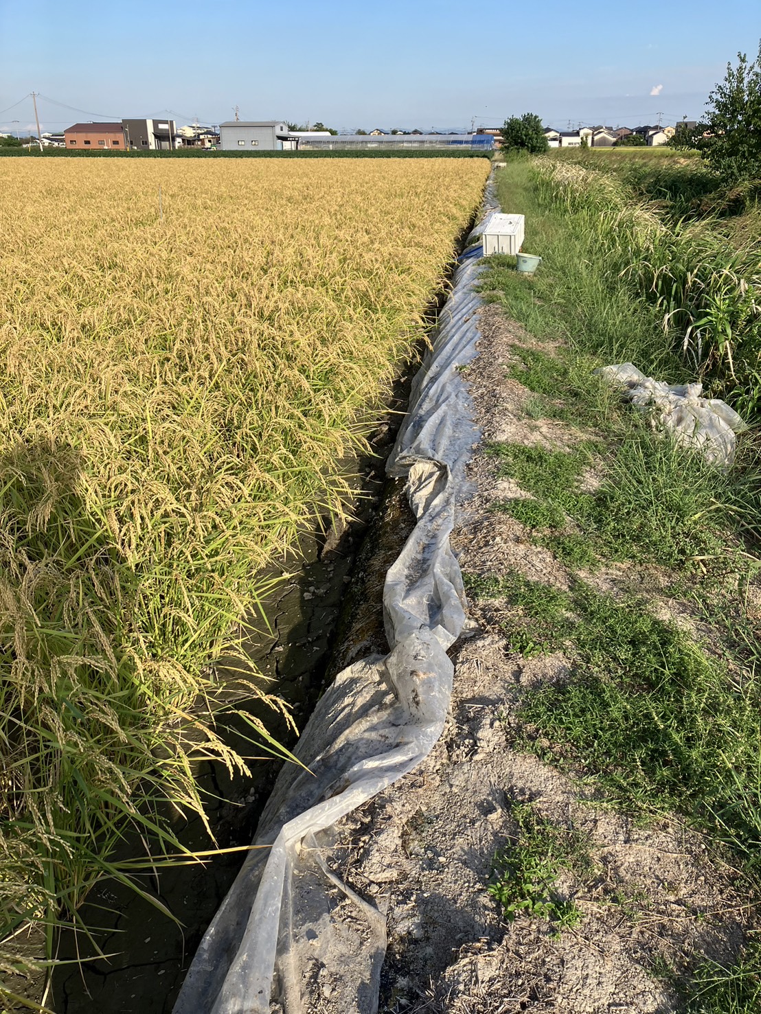 今日は川端に張ってあった水止め・草止め用のビニールマルチを土から抜きました。 収穫の時期が近づいているので、土もかなり乾いてきました。複数を外すのが大変になるため、今のうちに片付け