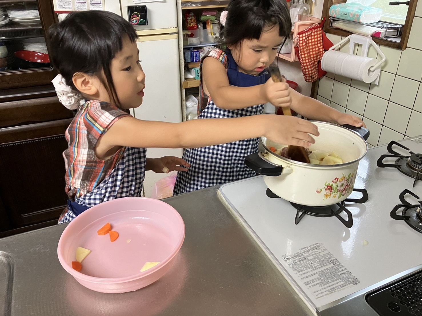 子どもたちは少し退屈そうにしていたので、夕ご飯のカレー作りに初挑戦することに。5歳の双子のシェフデビューです!