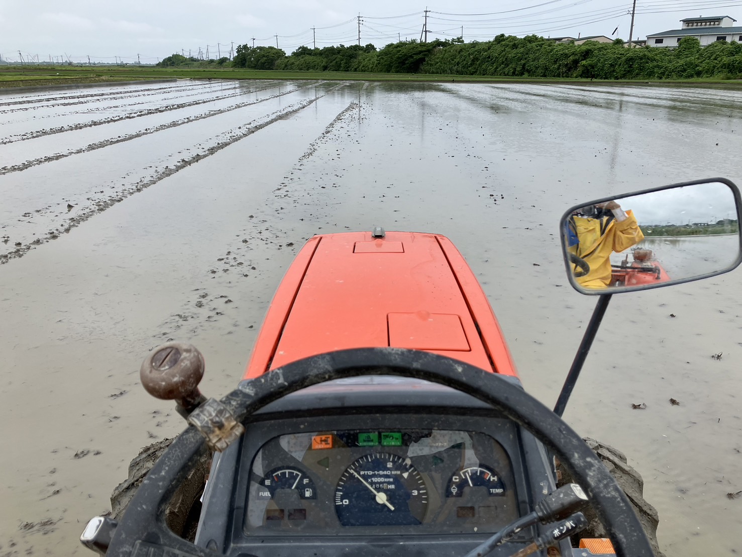 田植えの4日前、私たちは仕上げの代掻きを行っています。トラクターで土と水をかき混ぜ、田んぼをトロトロの状態にします。この作業により、土がしっかりと落ち着き、田植え機がスムーズに動くようになります。