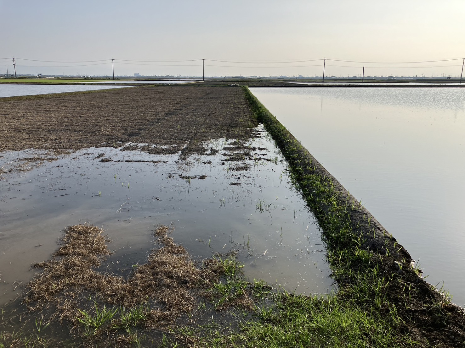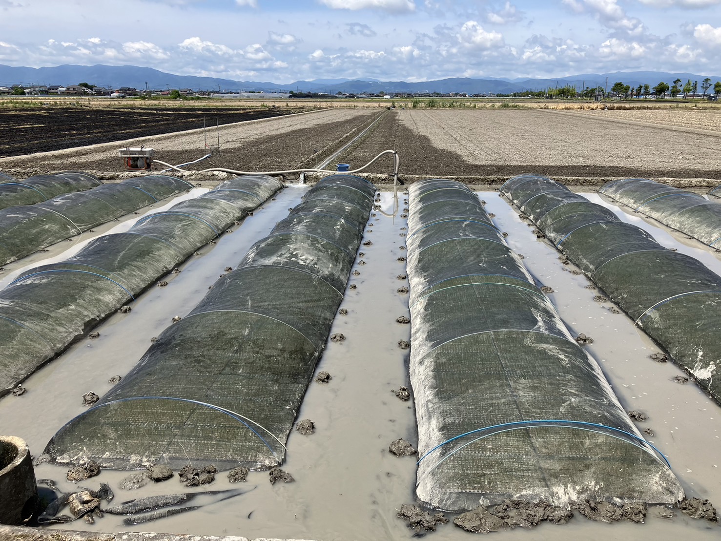 これからは、苗床の土を乾燥させるための準備に入ります。土をしっかり乾燥させることで、苗箱を苗床から外しやすくするのです。その後は、水を適度に入れたり、落としたりしながら、苗の成長を見守ります。