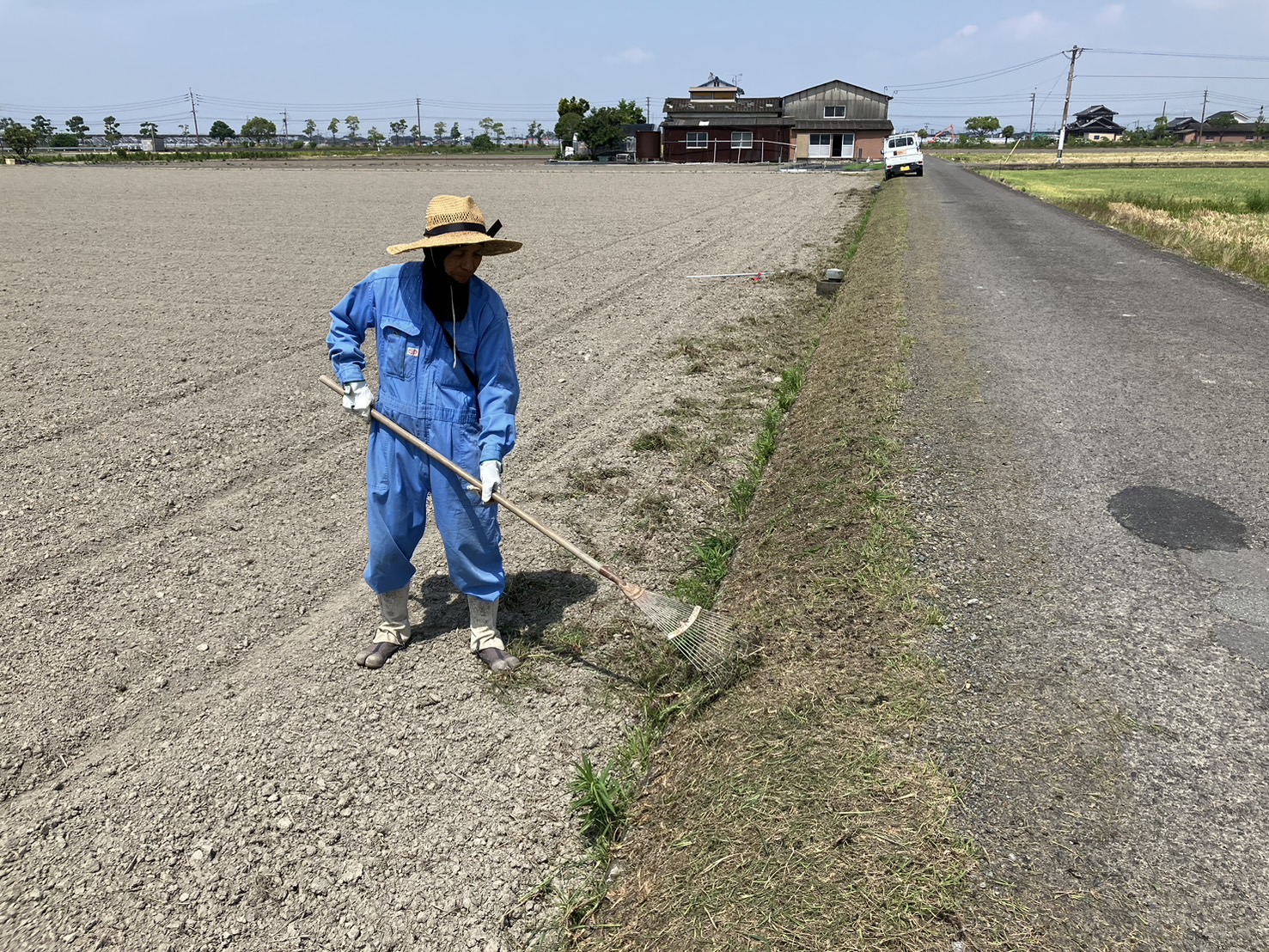 また、川端の畔も同様に松葉ほうきで掃いています。これは草除け水止めのビニールマルチを貼るためで、マルチと畔の間に隙間ができないようにするための大事な作業です。