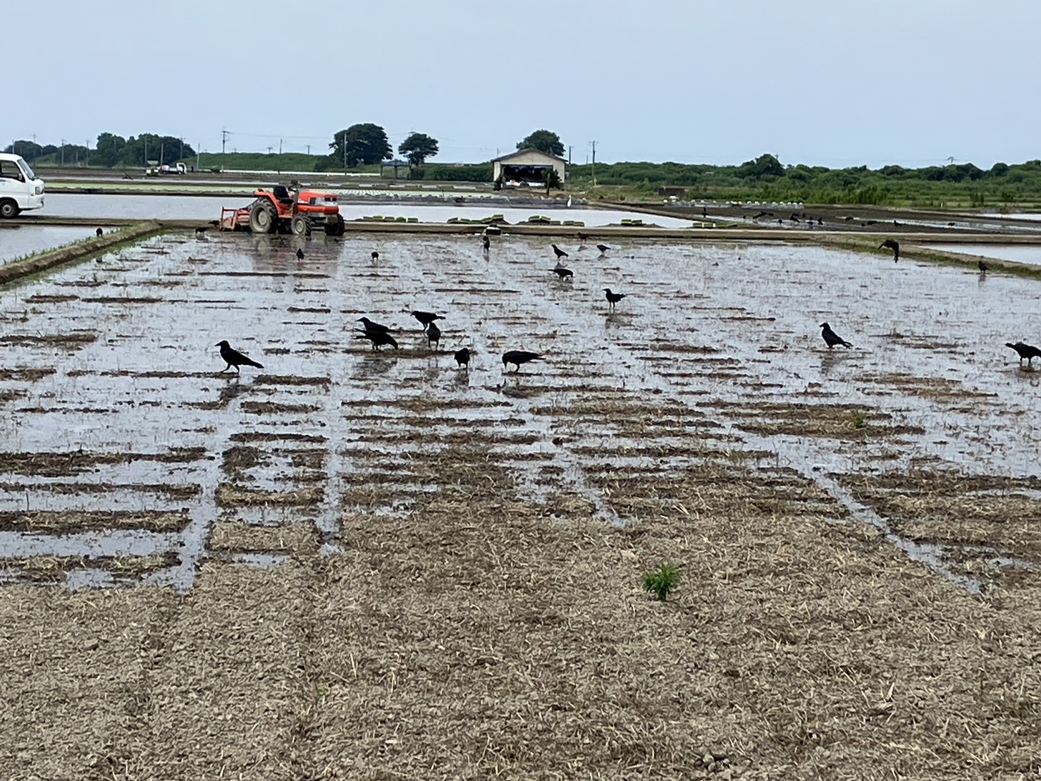 水を入れ始めた途端、空を見上げるとカラスの大群が飛来してきました。水田には虫やミミズが土から出てきて、カラスたちはそれを捕食しています。その様子はまるで自然の生態系が目の前で繰り広げられているかのようで、とても興味深いです。