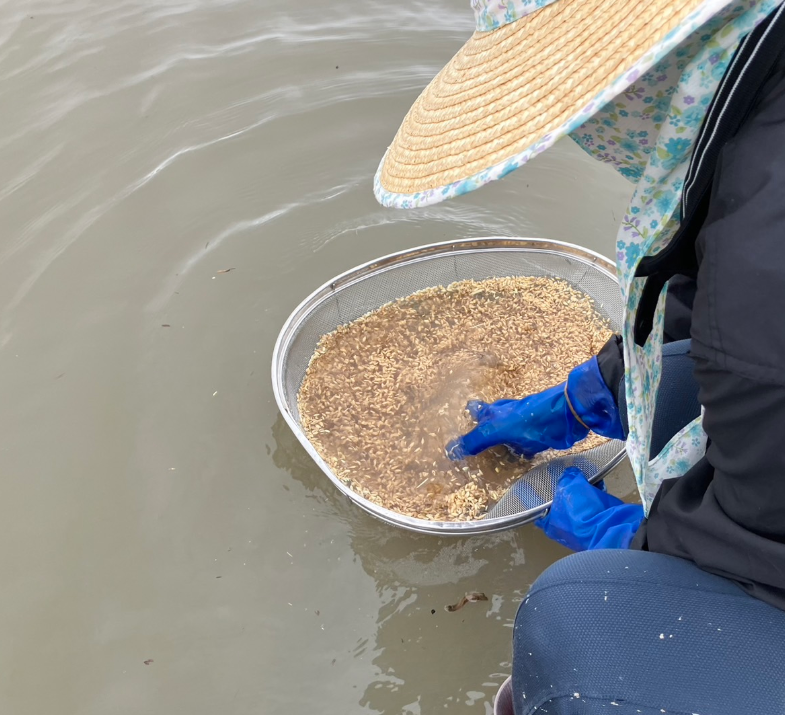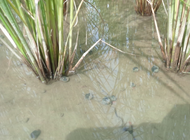 タニシが草を食べ終わると、稲の葉も食べ始めてしまいます。そのサインは、ちぎれた稲の葉が岸に流れ着くことがあります。そうなったら、また水を抜きます。この作業を何回か繰り返せば、草の少ない水田となります。